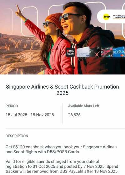 2025年7月15日起至10月31日, 使用DBS/POSB信用卡或借记卡购买新加坡航空 (Singapore Airlines) 以及酷航 (Scoot)机票可以额外获得 S$120 现金返还.